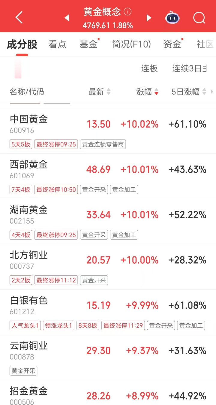 A股黄金概念股继续大涨。截至1月29日上午收盘,中国黄金、西部黄金、湖南黄金、北方铜业、白银有色等涨停,云南铜业、招金黄金等大涨。